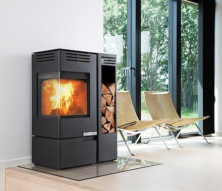 Cubist wood-burning stove with large corner glass to provide stylish view of the flames from several angles.This stove is best fitted on a straight wall. A new top plate ensures that the module is fully integrated with the stove.