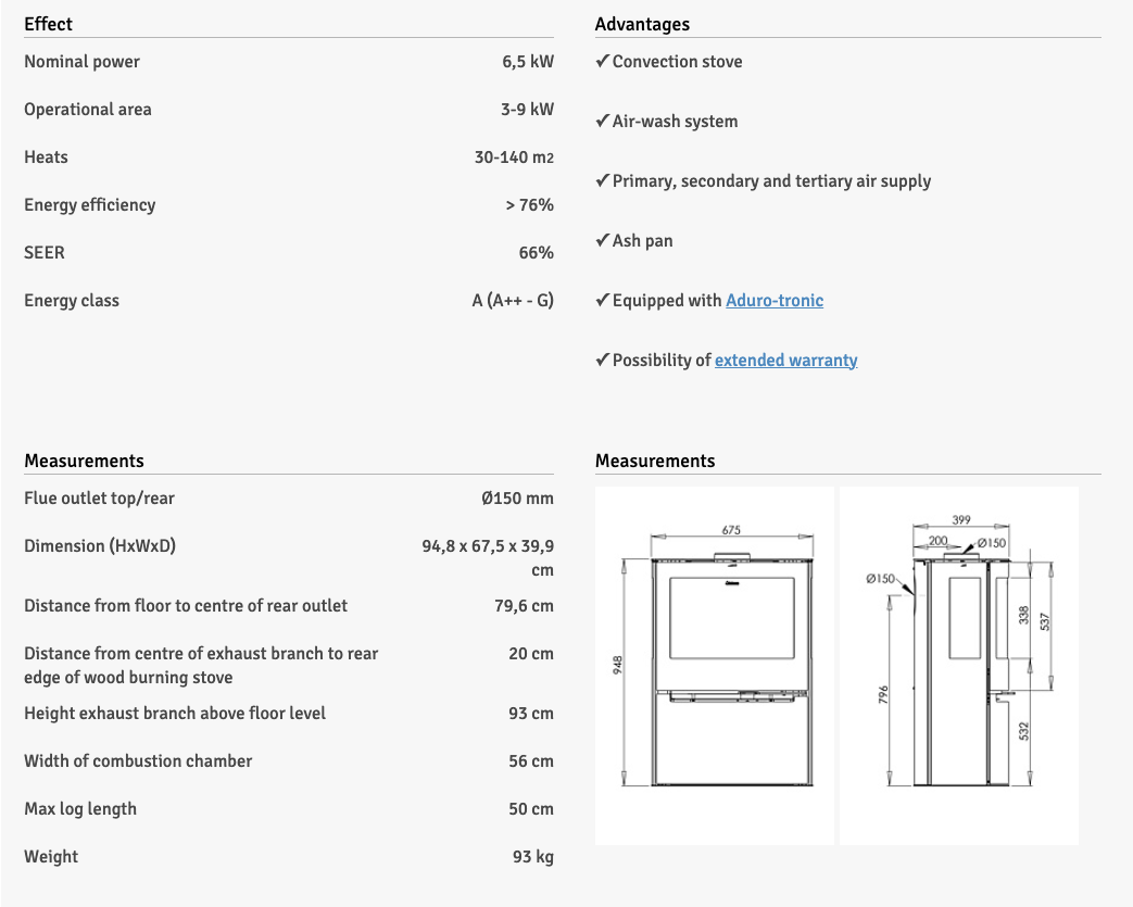 Aduro 21 is an ideal fit in tighter spaces because of its reduced depth – only 40 cm. The stove has an elegant and light appearance and blends naturally with other furniture. All three glasses have an effective air-wash system that prevents soot from accumulating on the glass. Below the combustion chamber, hidden behind a door, you will find a storage compartment for logs or kindling products. Aduro 21 has both a top and a rear flue outlet.